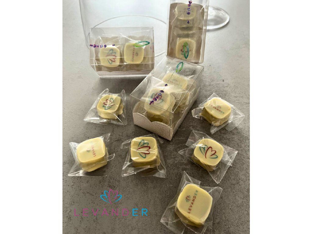 Čokoládové lanýže jsou zabaleny jednotlivě do celofánového sáčku a uloženy do průhledné potravinářské krabičky s obrázkem levandule.