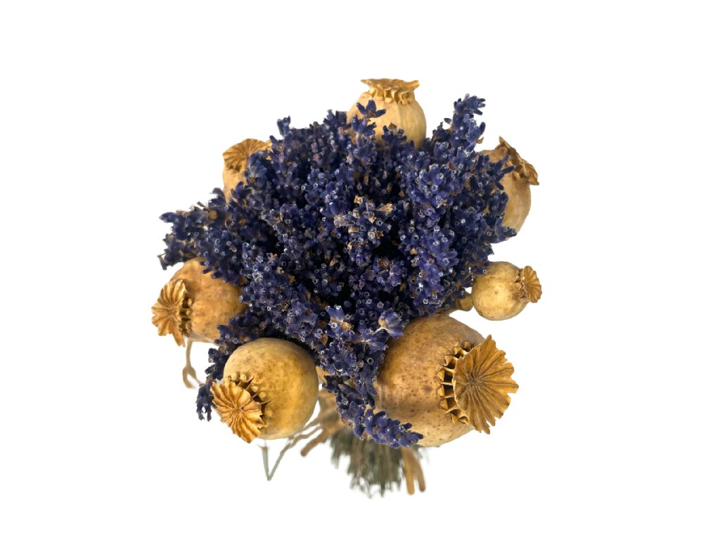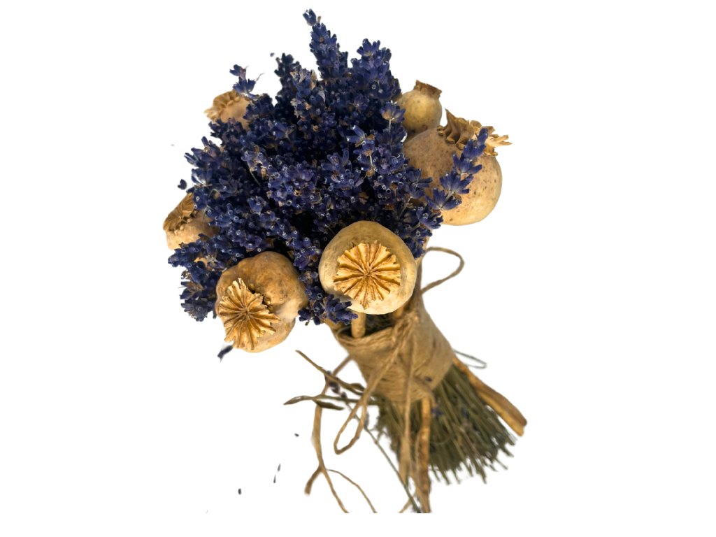 Kytka uvázaná ze sušené levandule lékařské a sušených makovic. Díky šetrnému sušení si levandule zachovává svou přirozenou barvu a krásnou vůni. Kytka je vhodná pro dekoraci.