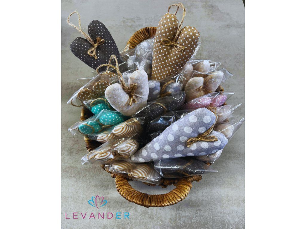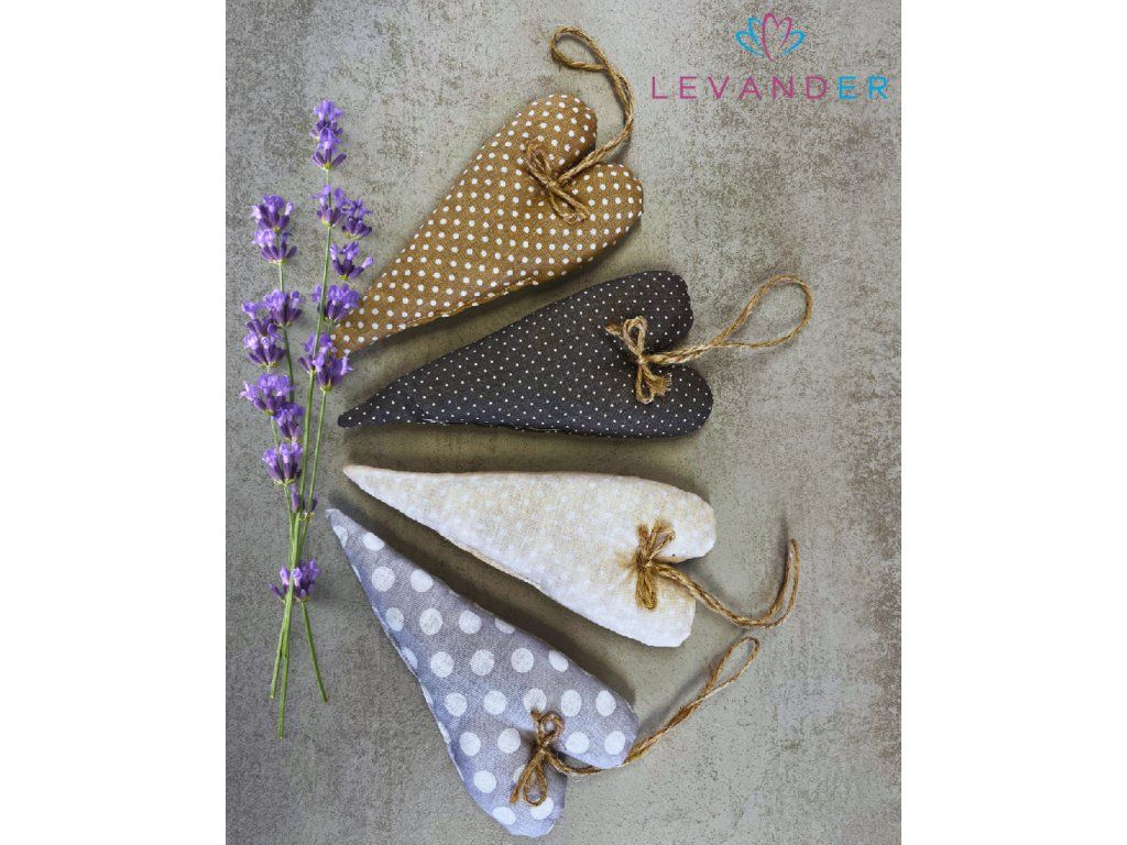 Polštářky jsou ušity ze 100% bavlny a jsou ozdobeny mašličkou z jutového provázku. Polštářky jsou naplněny dutým vláknem a sušenou levandulí.