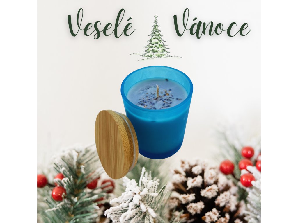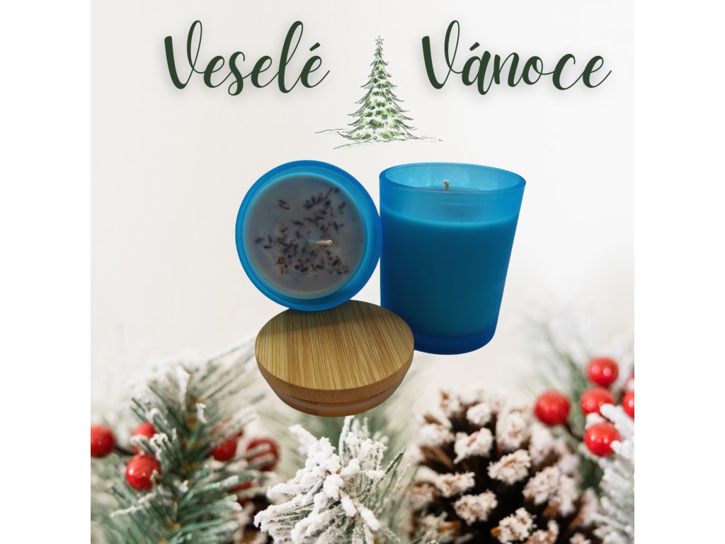 Sójová svíčka ve skle s bambusovým víčkem modrá se sušenou levandulí.