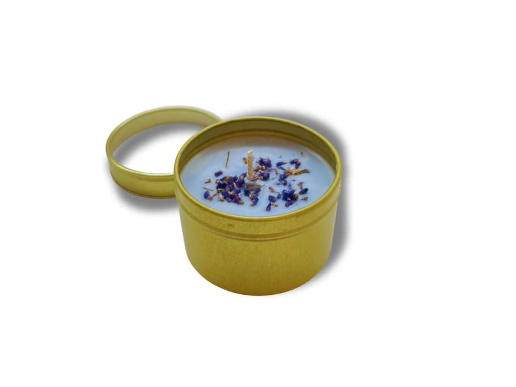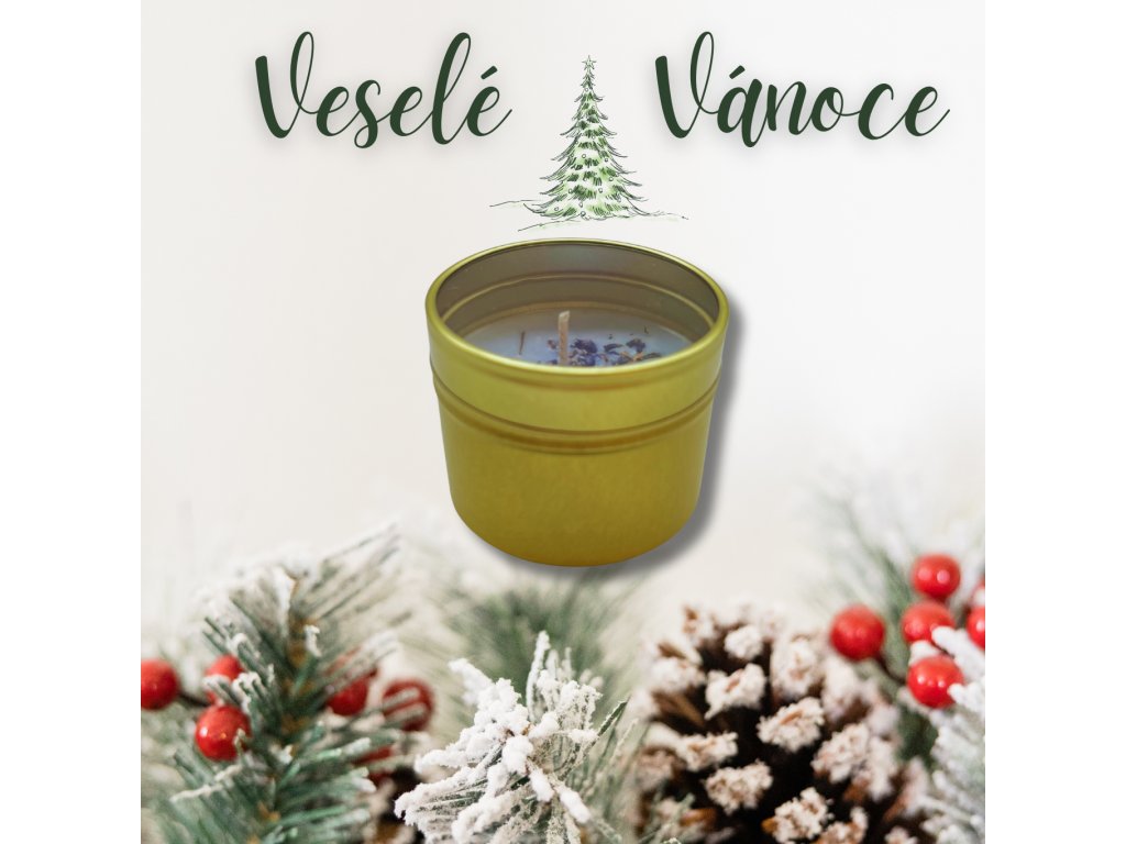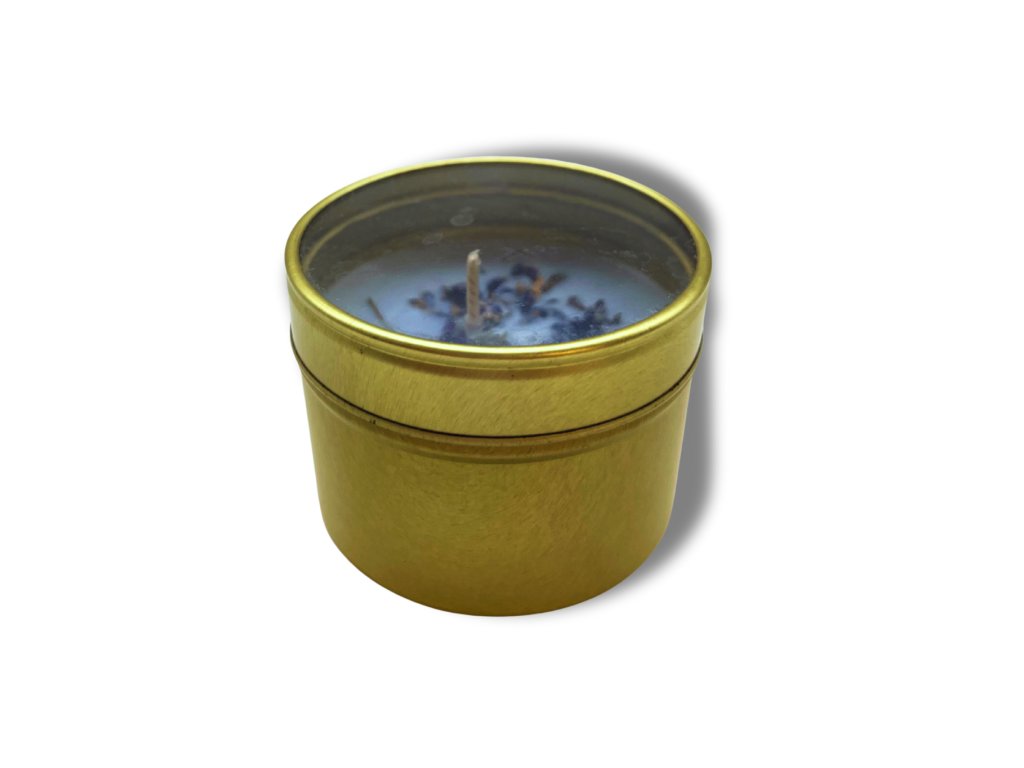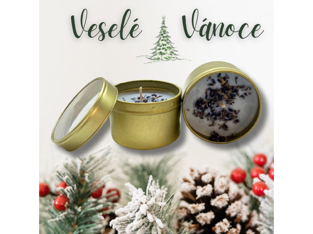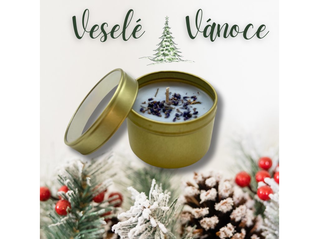 Sójová svíčka s modrým nádechem zimy ve zlaté plechové dóze s průhledným skleněným víčkem. Svíčka obsahuje snítky sušené levandule.