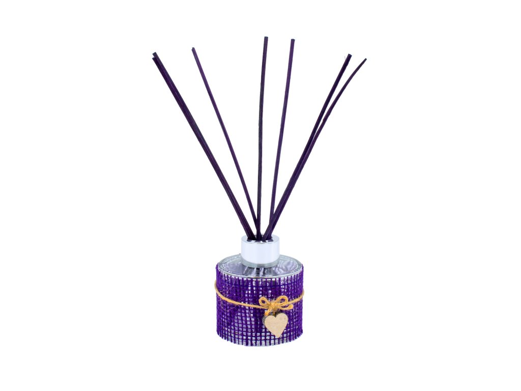 Minimalistický design se hodí do každého interiéru - do ložnice, do obývacího pokoje, koupelny i kanceláře. Díky ratanovým tyčinkám se vůně uvolňuje postupně a přetrvává po několik týdnů. Dekorační skleněná lahvička difuzéru je ozdobena fialovou jutovou manžetou a logem nebo ve variantě s dřevěným srdíčkem.